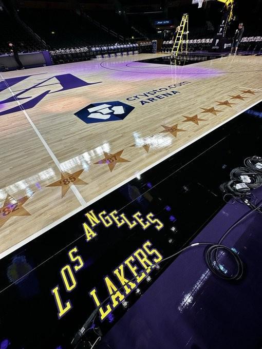 據(jù)記者Dave Mcmenamin曬出的照片,湖人隊(duì)今日將主場裝扮進(jìn)行了翻新,采用了“城市版”的地板裝扮,整體的色調(diào)更多采用了紫色。而此前湖人主場的常規(guī)裝扮是以黃色為主。